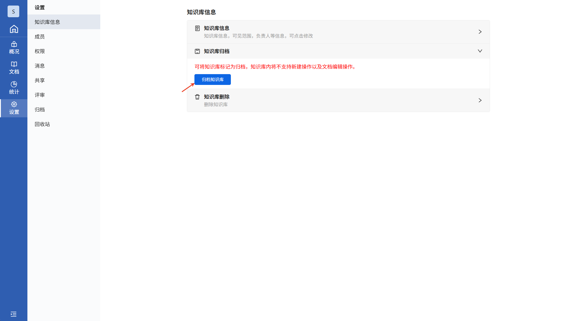 可以在归档页面归档当前知识库,也可以管理本知识库已经归档的目录和文档