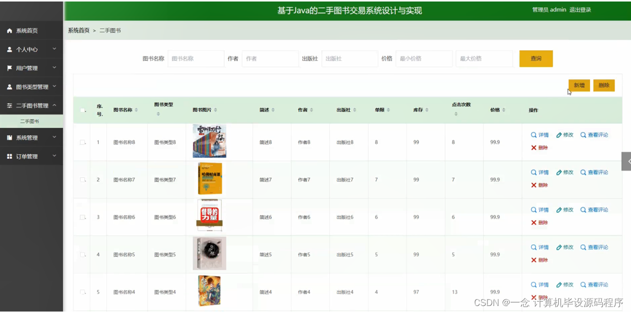 管理员点击二手图书管理,在二手图书管理页面中对图书名称、图书类型、图书图片、简述、作者、出版社、单限、库存、点击次数、价格等信息,进行查询、新增或删除二手图书等操作。如图5-11所示: