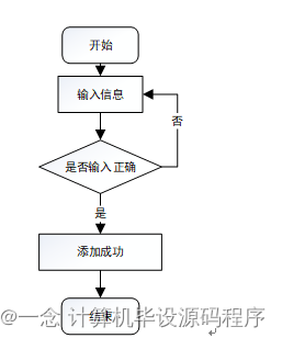 然后是添加信息的页面。进入该页面后,页面会出现一个提示框,示意操作者可以进行信息的添加,从而进行下一步的操作。用户输入想要添加的信息后提交,系统会对输入的内容进行检测。如果检测后输入的信息正确,则会出现“添加成功”的提示框,从而可以进行下一步操作;如果系统检测后检测到想要添加的信息不符合规范要求,则会提示报错,需要进行修改后重新添加。添加信息流程图如图3-2所示: