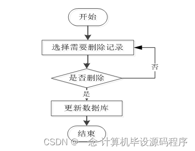 最后为删除信息页面。进入该页面后,用户可以对所要删除的信息进行选择,选择好删除的内容后,会有一个“是否确认删除”的提示框,操作者可以根据自己的意愿来选择“是”或“否”。完成上述操作,系统会自动的对删除的内容进行判断,如果符合删除要求则会成功删除数据记录,并且更新数据库的内容信息;如果删除的数据记录不符合要求,则会有一个“删除失败”的提示框,操作人员需要根据提示来进行修改,修改完成后重新删除知道删除成功。删除信息流程图如图3-3所示: