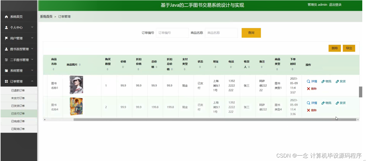 管理员点击订单管理,在订单管理页面中对已取消订单、已退款订单、未支付订单、已发货订单、已支付订单、已完成订单等信息,进行查询或删除订单信息等操作。如图5-13所示:
