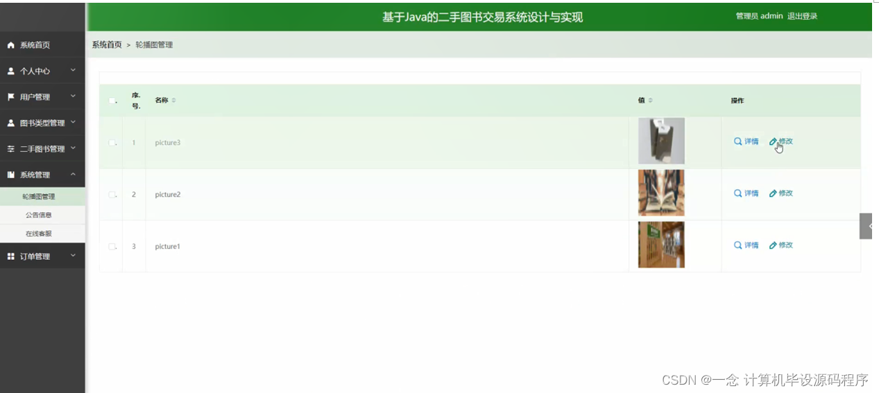 管理员点击系统管理,在系统管理页面中对轮播图管理、公告信息、在线客服等信息,进行查询或删除系统信息等操作。如图5-12所示: