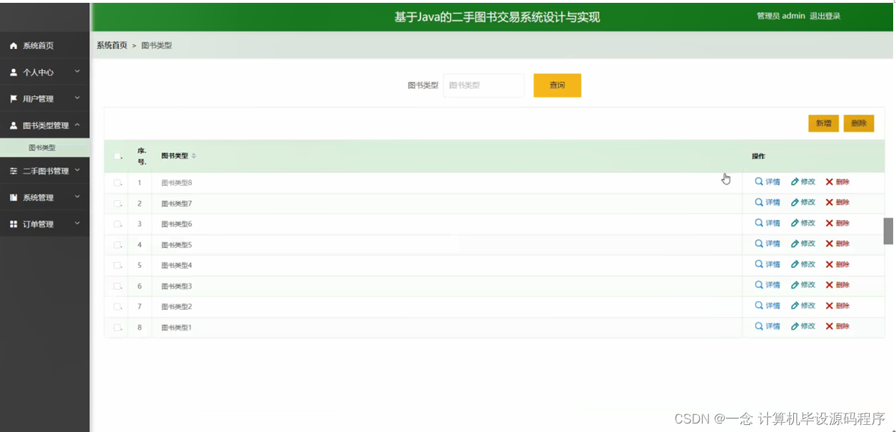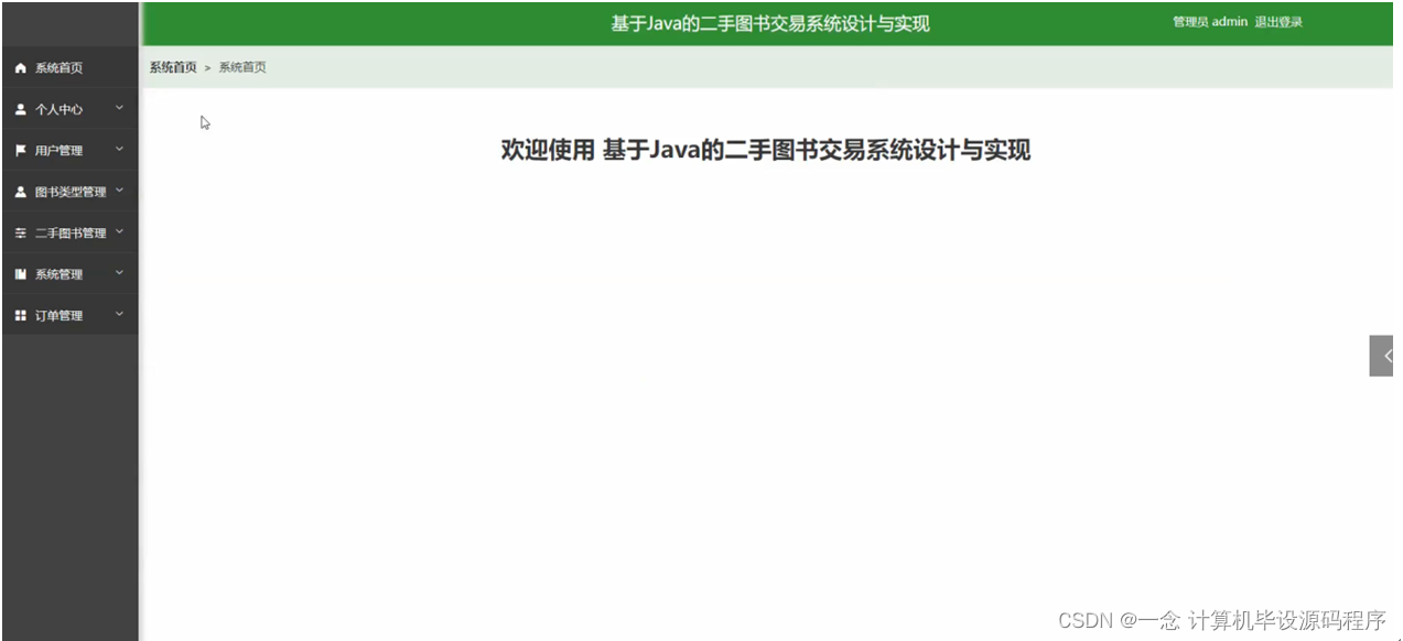 管理员进入系统主页面,主要功能包括对系统首页、个人中心、用户管理、图书类型管理、二手图书管理、系统管理、订单管理等进行操作。管理员主页面如图5-8所示: