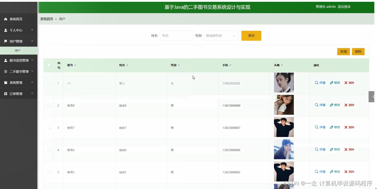 管理员点击用户管理,在用户管理页面中输入账号、姓名、性别、手机、头像等信息,进行查询、新增或删除用户信息等操作。如图5-9所示: