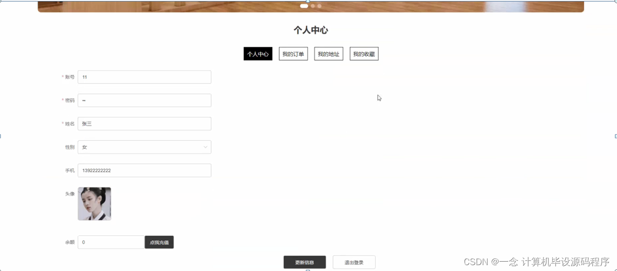 在个人中心页面可以更新个人详细信息,还可以对我的订单、我的地址和我的收藏进行详细操作,如图5-6所示: