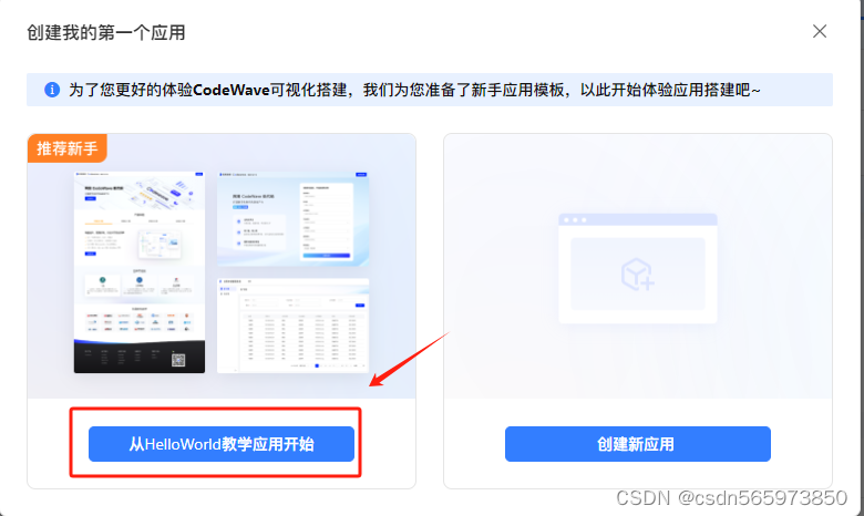 在创建应用弹出页面,新手选择【从HelloWorld教学应用开始】