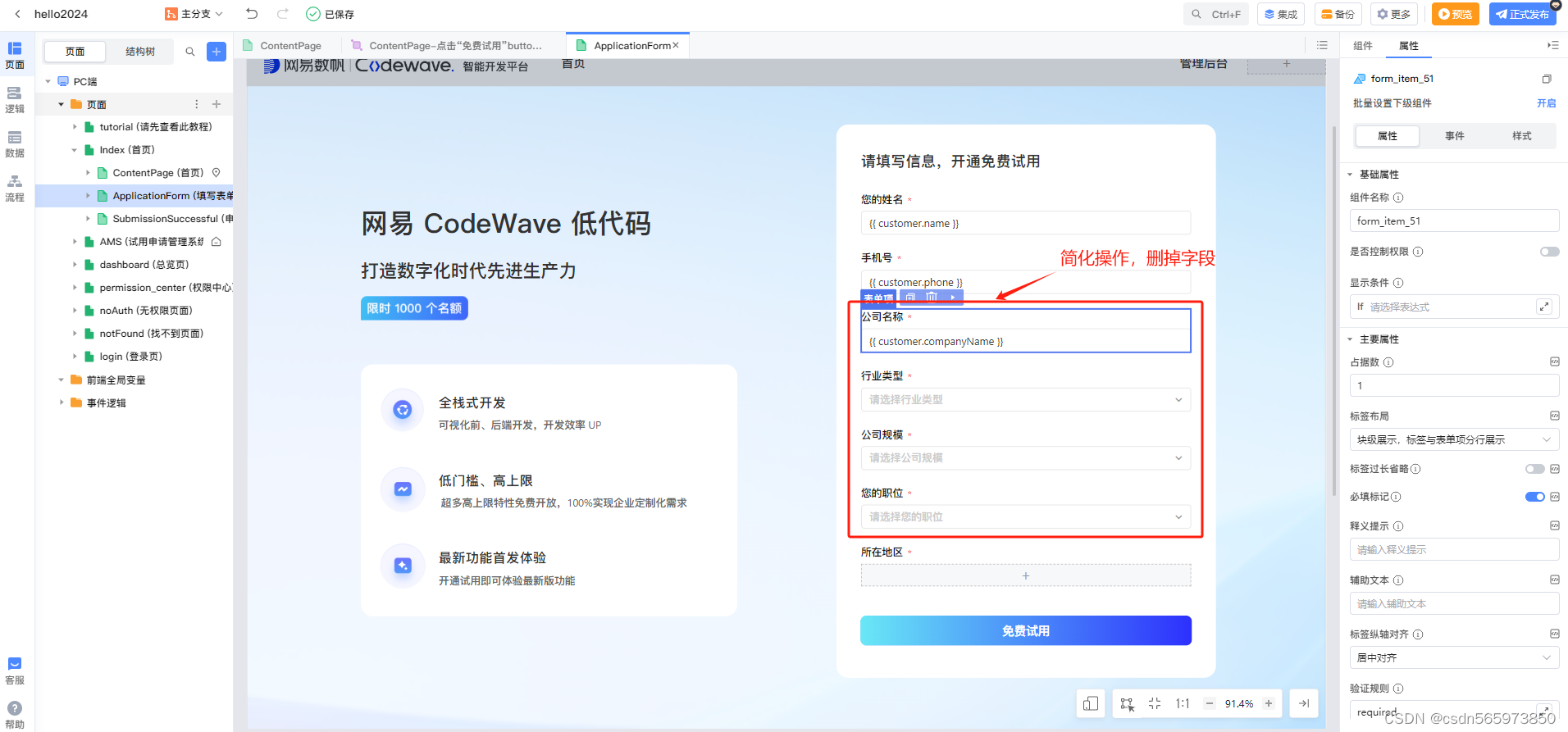 点击ApplicationFrom(填写表单) 简化表单内容,删掉红框选定字段,添加地区字段