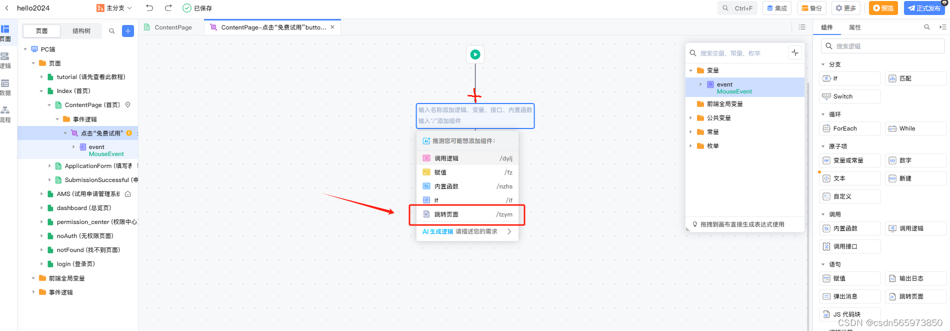 在事件逻辑页面点击中间 + 号,选择 跳转页面