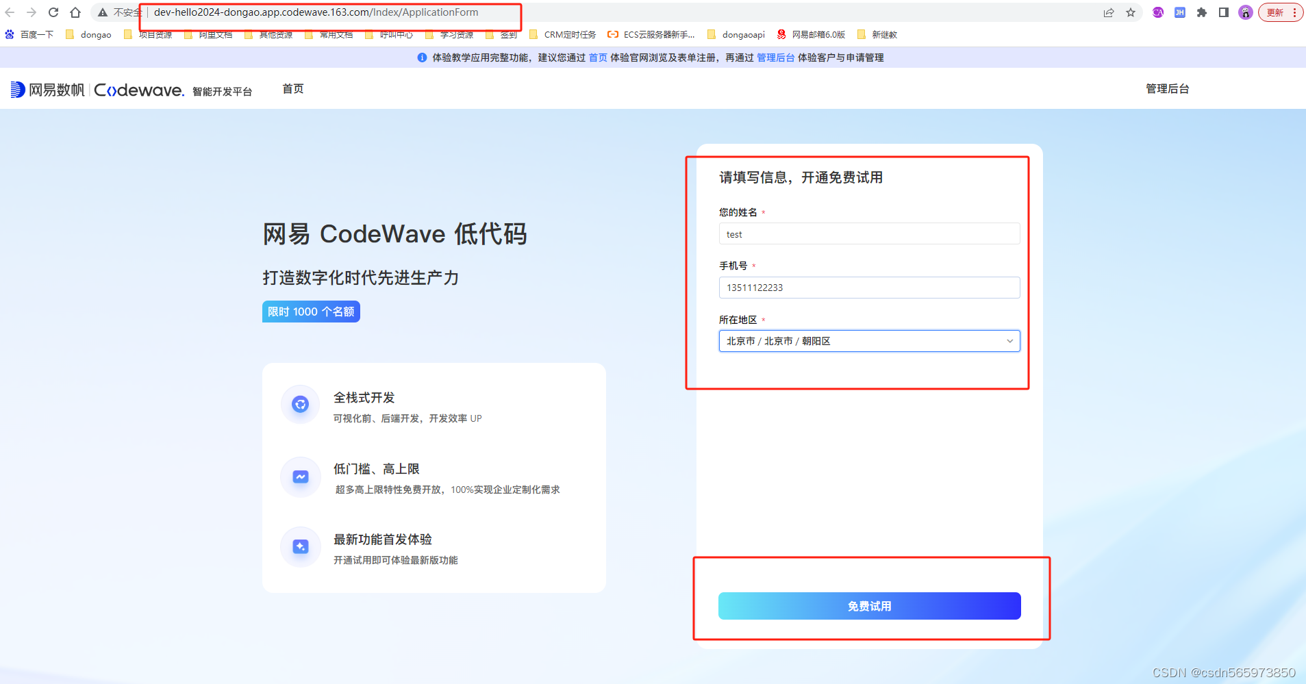 跳转的预览页面,输入姓名、手机号、所在地区,点击【免费试用】
