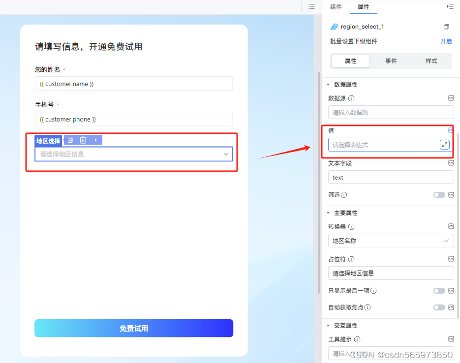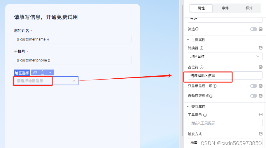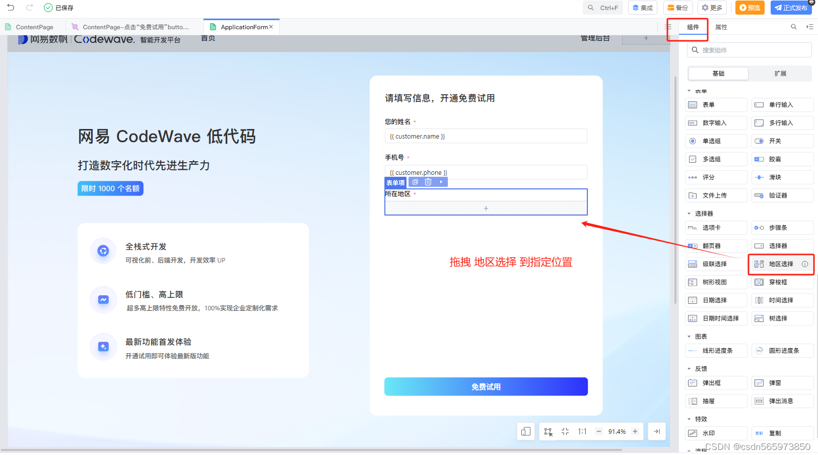 选中 【所在地区】,点击右侧【组件】选择【地区选择】拖拽到指定位置