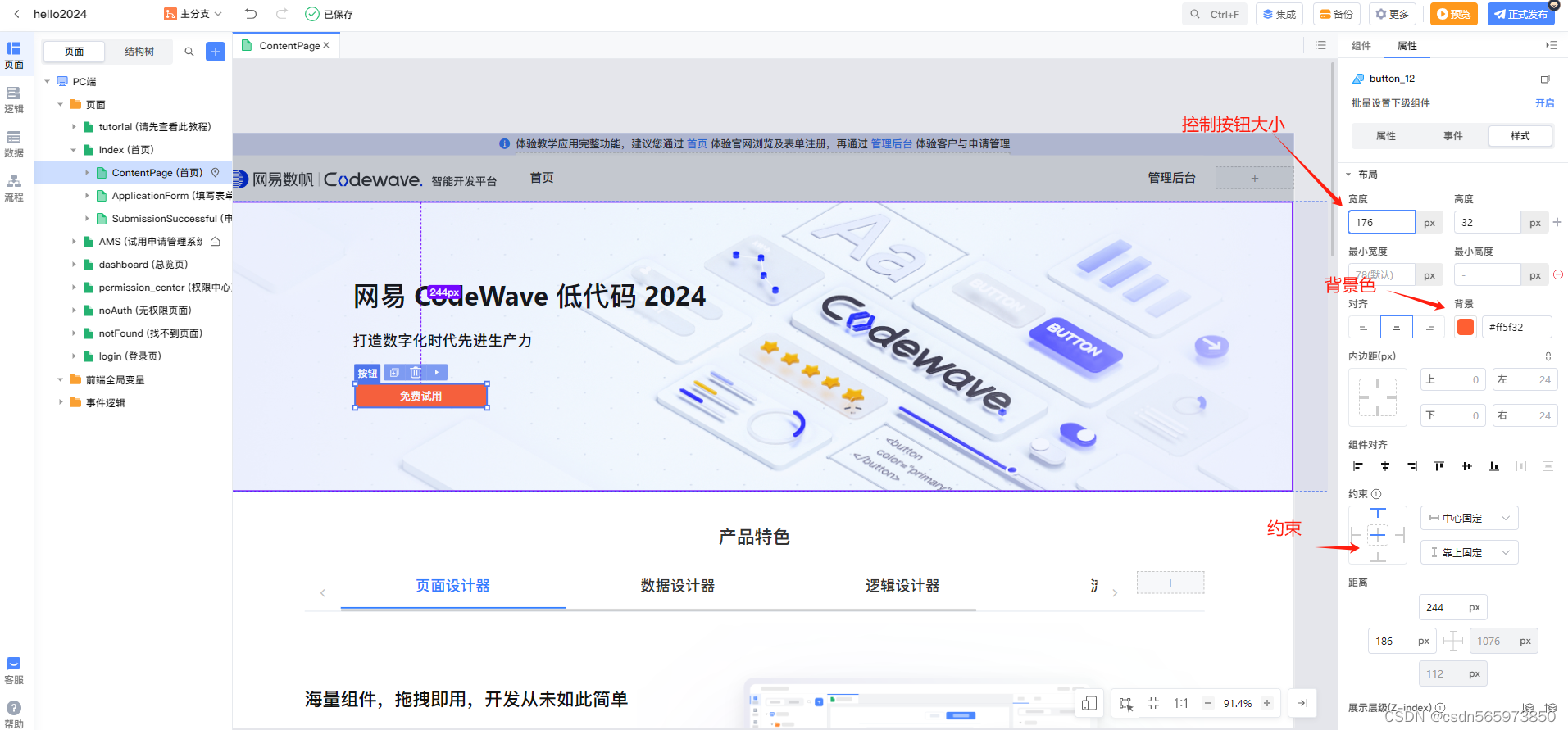 对于按钮的属性,比如宽度,高度,文字内容等,都可以在按钮上操作。或者到右侧按钮的属性、事件、样式上操作都是可以的,很方便。