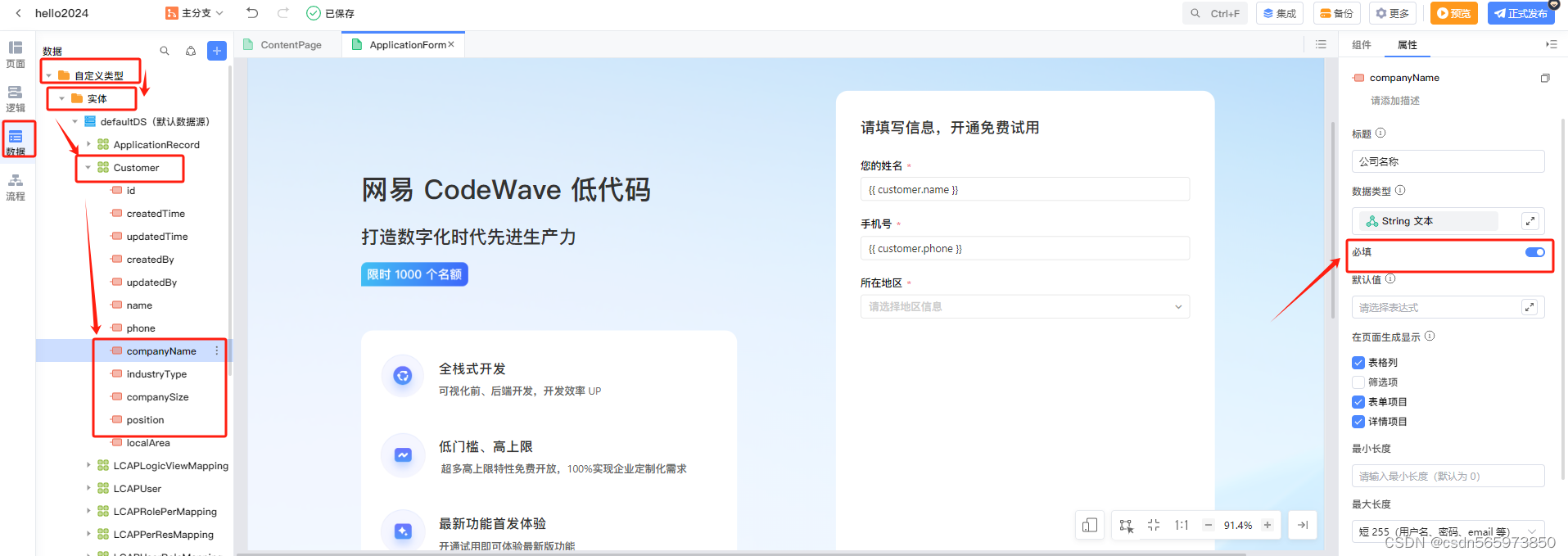 说明数据在页面校验没有通过,因此导致提交失败,这里查看一下实体对象 customer 的属性信息,点击【数据】-【自定义类型】-【实体】-【Customer】,找到刚才删除的属性信息,选中查看字段属性信息,发现是【必填】,将刚才页面简化的字段的【必填】全部设为非必填。