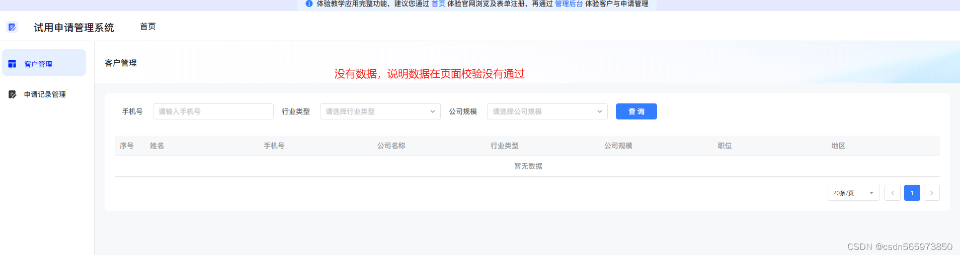 点击页面右上角【管理后台】跳转到管理后台页面,(这里说明一下,首次跳转到管理后台页面是需要输入用户名、密码的,用户名和密码就在弹框域名链接后面的)可以看到刚才填写的免费申请数据已经保存成功可以查询到了