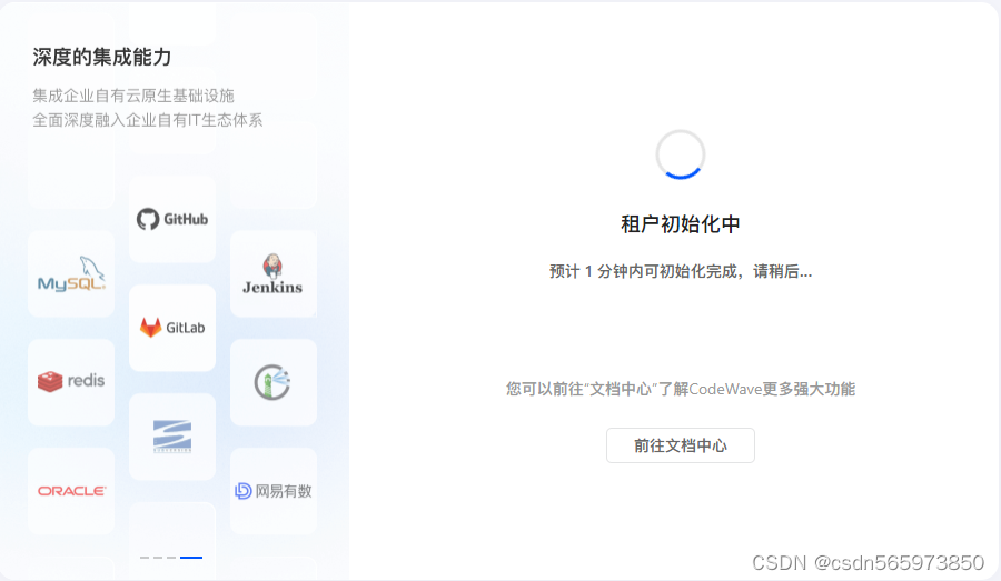 点击【创建】完成第一个低代码开发平台应用的创建。应用创建成功后会进入应用初始化页面,初始化成功之后可以看到低代码开发平台页面如下信息