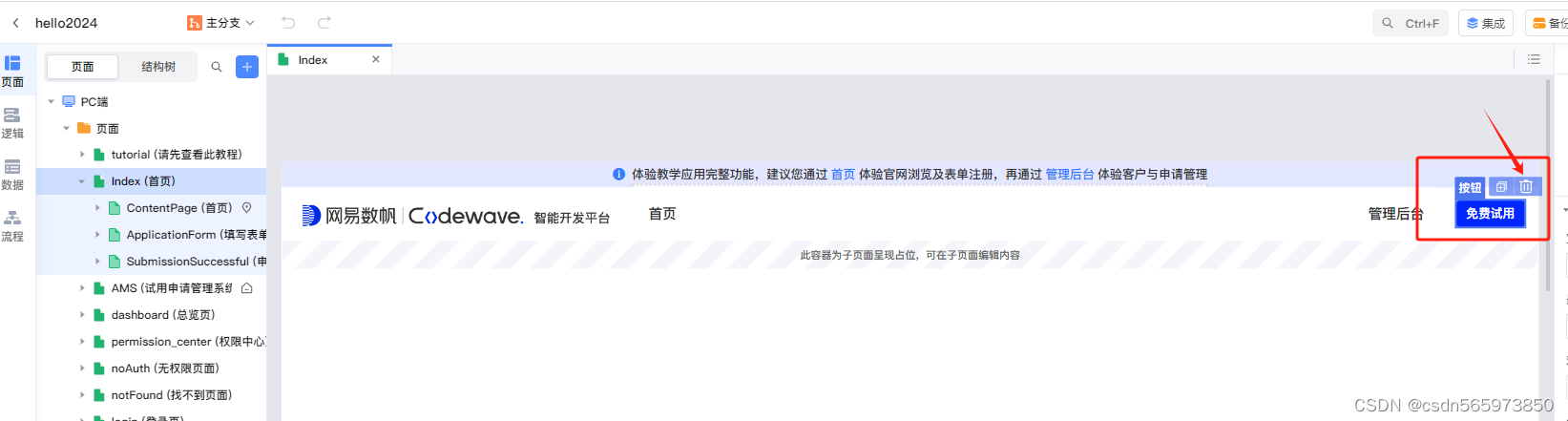 应用创建完成之后,现在就开始搭建应用,这里由于选择的是新手模版,新手模版默认的是对于免费试用的一系列操作,那么我们这里就把Index首页原来的免费试用按钮都去掉,然后我们自己添加一个按钮来体验整个流程。