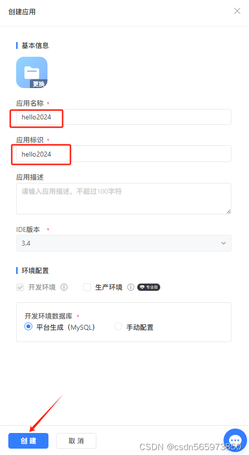 在创建应用的详细内容页面输入应用名称、应用标识,其他内容默认选项即可
