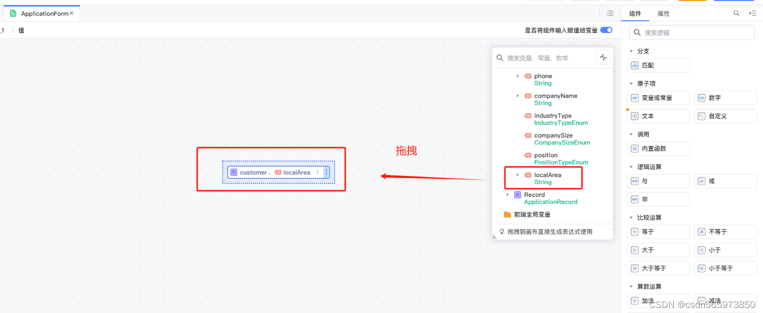 在值选择页面,选择customer 的属性 localArea拖拽到编辑区域
