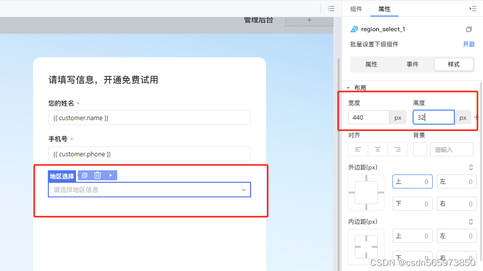 调整地区下拉框宽度和高度,点击【样式】输入宽、高调整,这里的表单页面下拉框宽度和高度不支持鼠标缩放