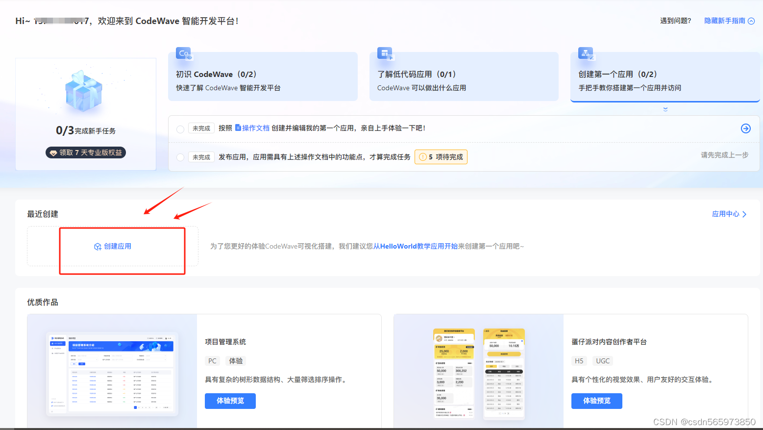 在Codewave智能开发平台首页点击页面上的【创建应用】