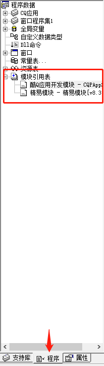 进入到 com.carter.group 目录中使用易语言破解版打开 app.e 文件,点击左边的程序,将使用到的模块引入,默认会引入SDK,这边只需要引入精易模块即可。