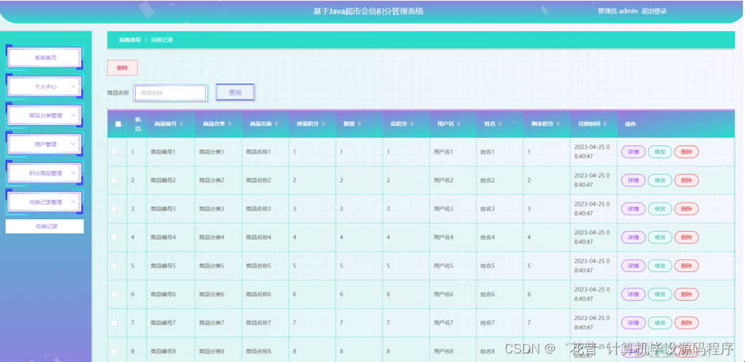 (4) 兑换记录管理:管理员可以对兑换记录信息进行详情、修改或删除操作。