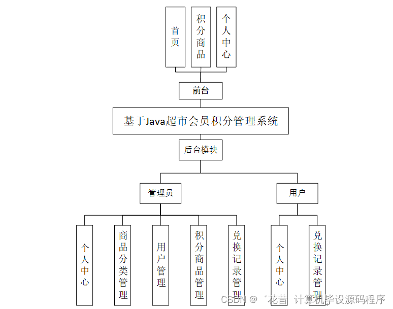 本课题要求实现优质的超市会员积分管理系统,就一定要包含有前台页面和后端数据库、服务器相联系,从而实现系统的功能运转。系统分为用户模块和管理员模块两部分,用户包括注册登录、个人信息修改,对积分商品进行查询,备注或收藏和查询兑换记录等;管理员包括登录、个人信息修改,对商品分类管理、用户管理、积分商品管理、兑换记录管理等功能进行查询,新增,修改和删除等。