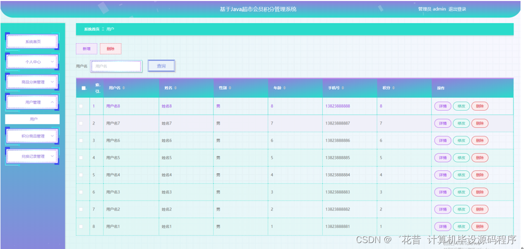 管理员点击用户管理。在用户页面输入用户名进行查询、新增或删除用户列表,并根据需要对用户详情信息进行详情、修改或删除操作;如图5-8所示: