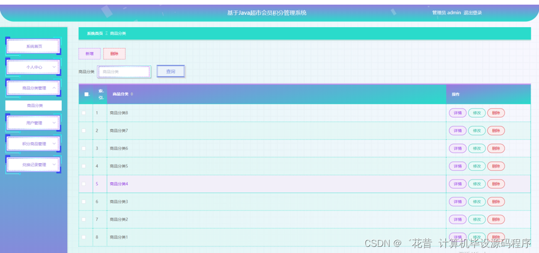 (2) 商品分类管理:管理员可以对商品分类信息进行查看详情,修改或删除操作。