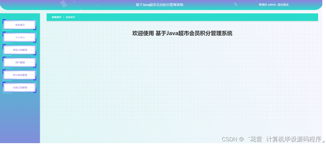 管理员进入主页面,主要功能包括对个人中心、商品分类管理、用户管理、积分商品管理、兑换记录管理等进行操作。管理员主页面如图5-6所示:
