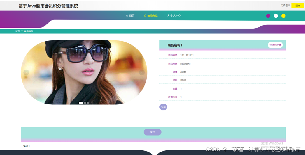 积分商品:在积分商品页面的输入栏中输入商品名称和选择商品分类进行查询,可以查看到积分商品详细信息,并根据需要进行兑换、备注或收藏操作;积分商品页面如图5-3所示: