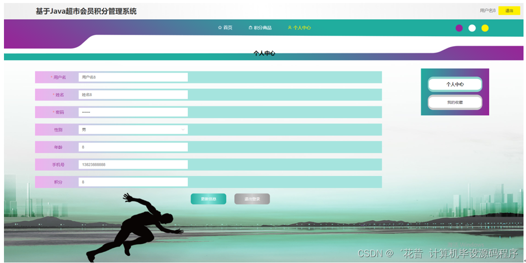 个人中心:在个人中心页面通过填写个人详细信息进行信息更新操作,还可以对我的收藏进行详细操作;如图5-4所示: