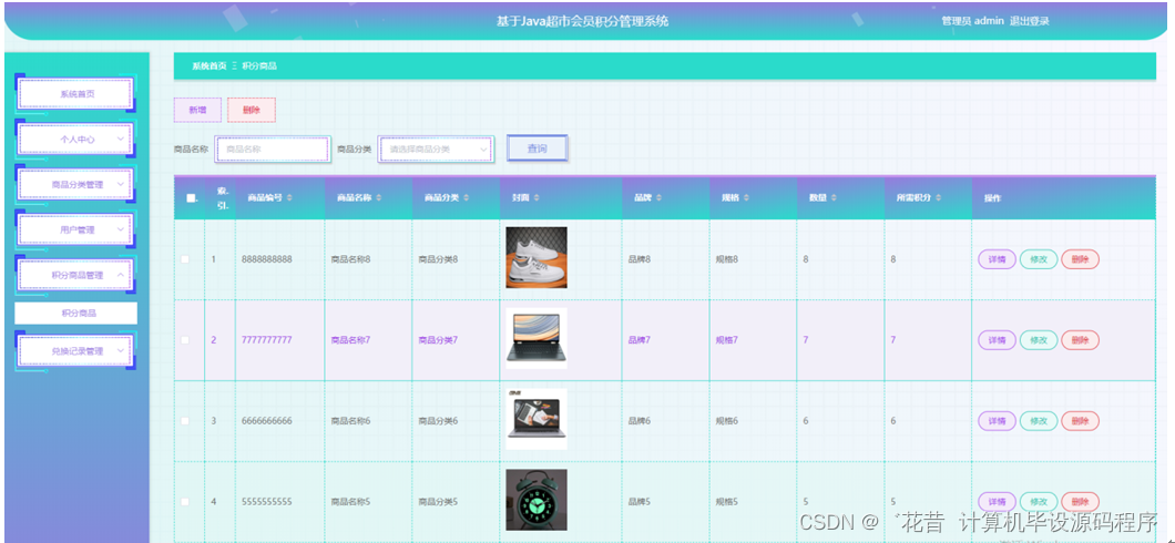 (3) 积分商品管理:管理员可以对积分商品信息进行详情、修改或删除操作。