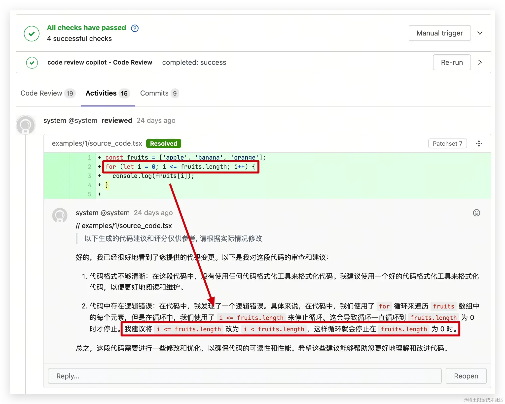 这里机器人账号调用 Gitlab API 进行的评论,会默认被 Resolved,这样可以避免 CR Copilot 评论过多造成每个评论要手动点下 Resolved