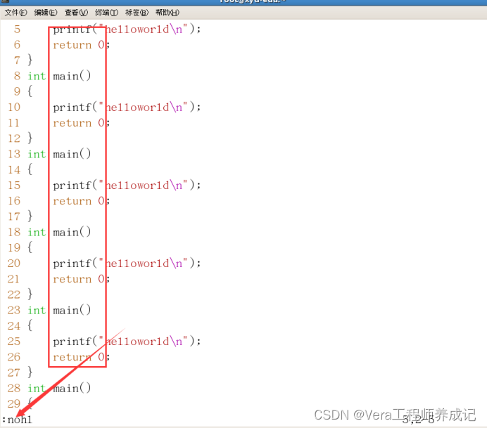 因为我们查找printf,因此vim给我们把所有的printf全用高亮的颜色标注出来了,如果停止查找后它不会把这些标注的颜色去掉,如果你有强迫症,可以在“:”形式的底行模式下输入“nohl”,h就是high高的意思,l 就是light亮的意思,no high light就是不要高亮的意思。