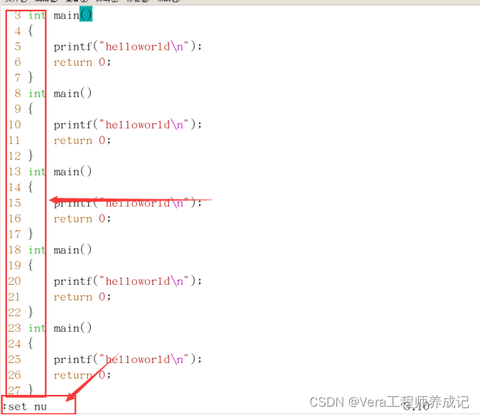 如果你想再次调出这些行号,可以输入“set nu”即set number就是设置编号的意思。