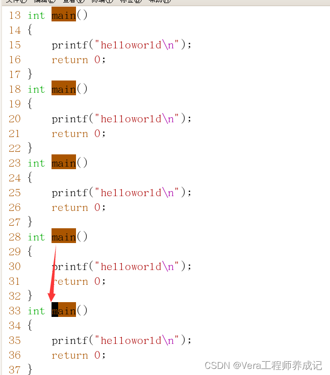 把光标main的m字母上,按一下shift+8,即“*”号(用于查找),光标就可以跳到下一个main了