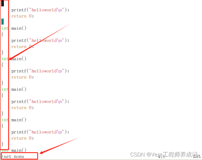 在冒号底层模式下输入“set nonu”就是set no number设置没有标号的意思,当我们这样输入后,回车就发现左侧的这一整列行号全不见了