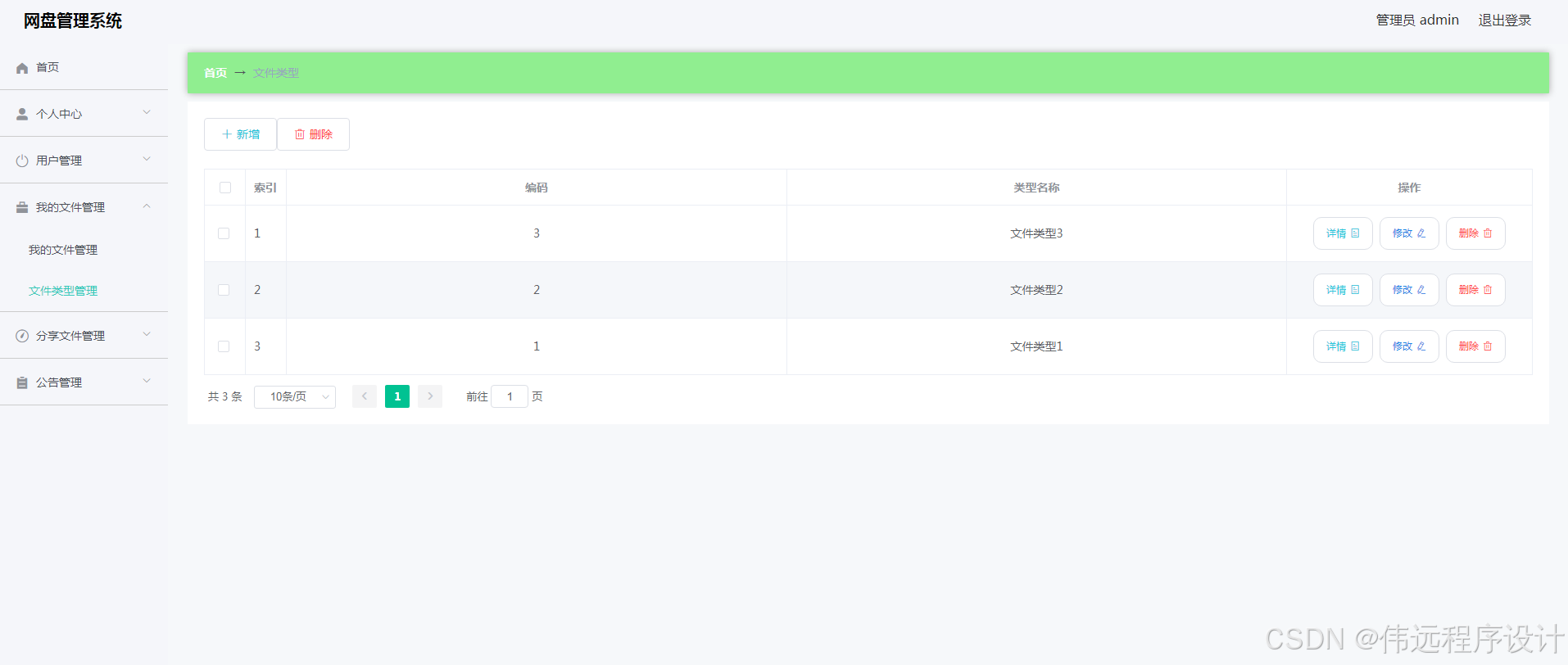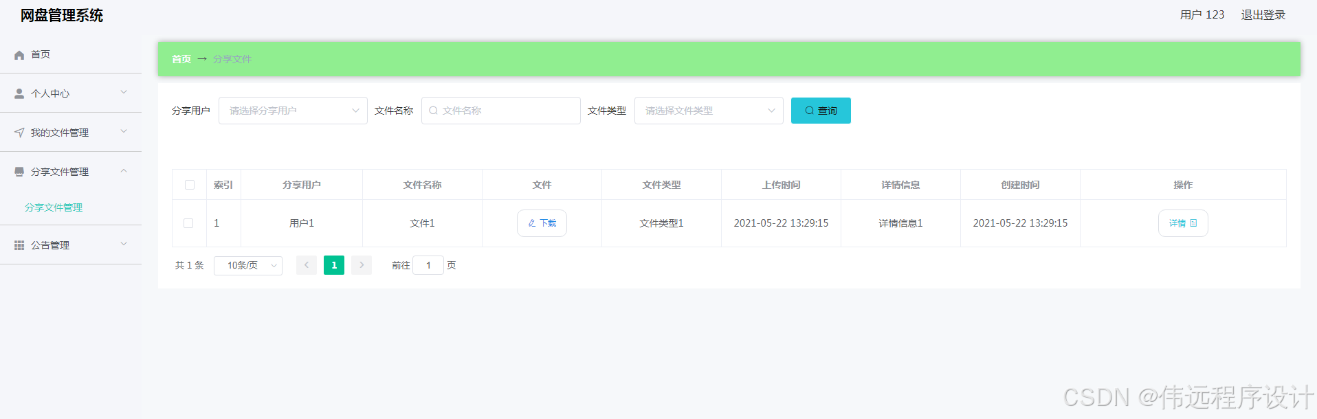 The network disk management system is to establish a data table in MySQL to save information, and use Vue framework and Java language to write. And in accordance with the software design and development process for design and implementation. The system is friendly and fully functional. After the administrator logs in and enters his backend, he manages users, manages file types, manages announcements, and downloads and inquires about files shared by users. Users upload files, share files, view announcements, and file information successfully shared.