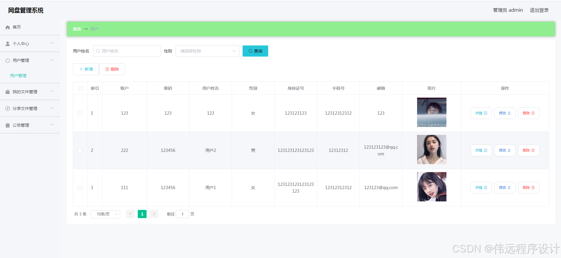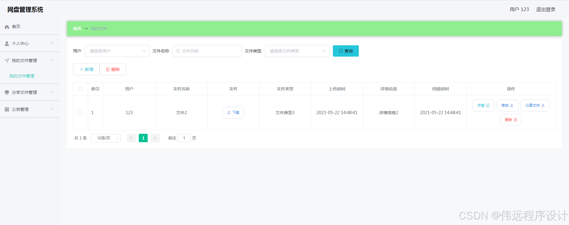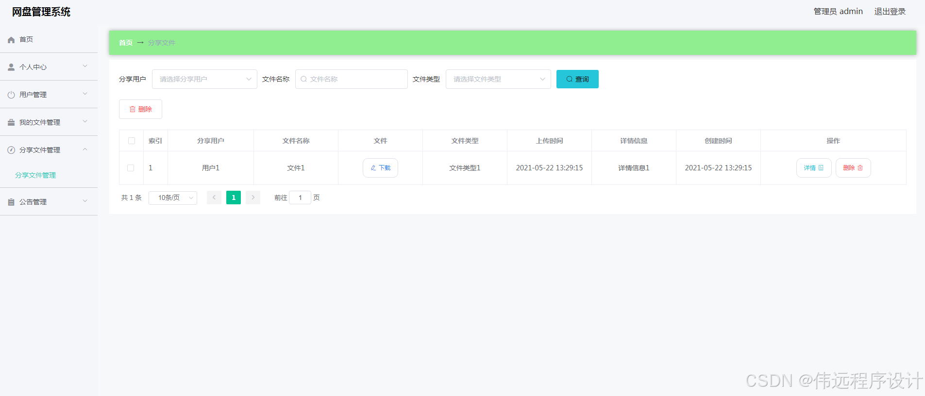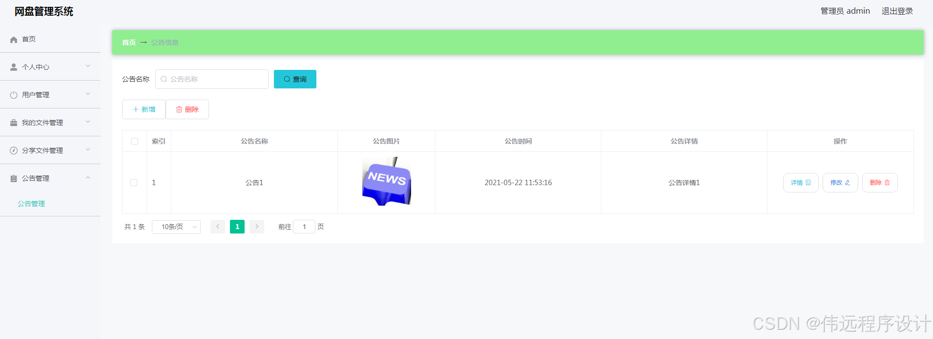 网盘管理系统是在MySQL中建立数据表保存信息,运用Vue框架和Java语言编写。并按照软件设计开发流程进行设计实现。系统具备友好性且功能完善。其管理员登录进入本人后台之后,管理用户,管理文件类型,管理公告,下载和查询用户分享的文件。用户上传文件,分享文件,查看公告以及成功分享的文件信息。