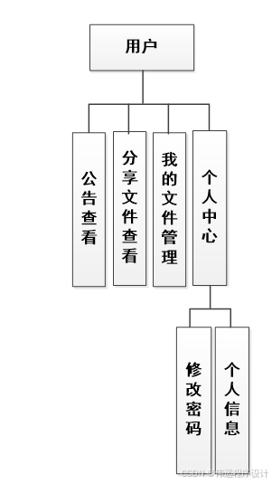 设计的用户的详细功能见下图,用户上传文件,分享文件,查看公告以及成功分享的文件信息。