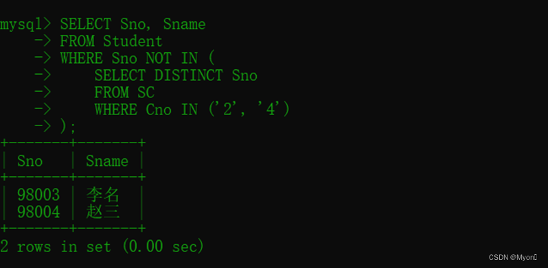 [5] 检索至少不学2和4两门课程的学生学号与姓名。