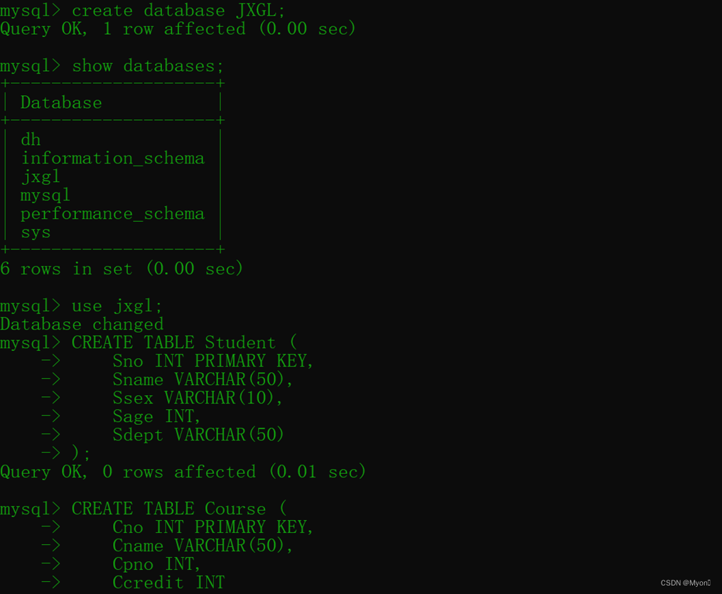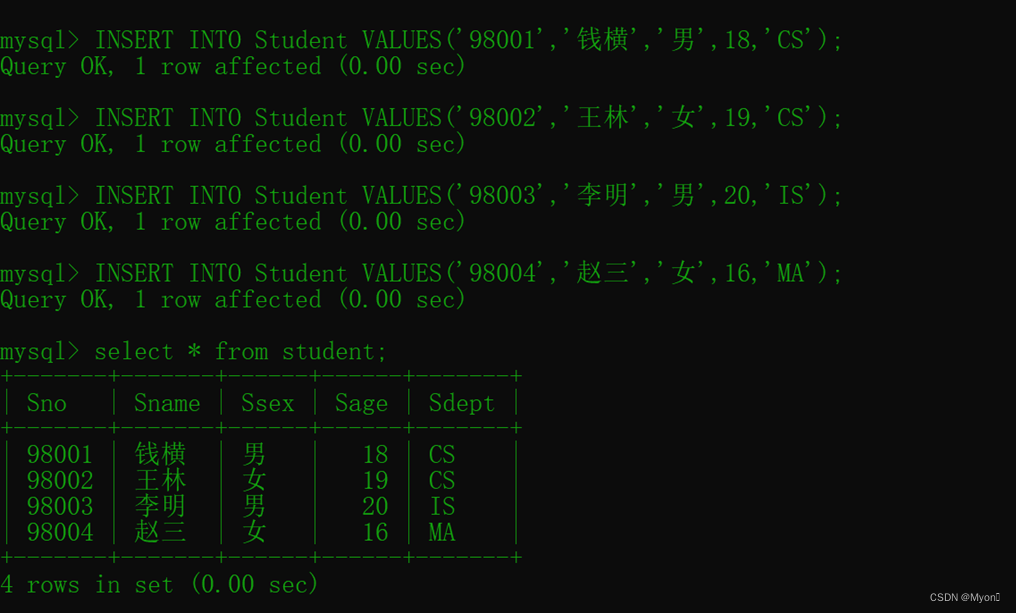 (1)学生表Student,由学号(Sno)、姓名(Sname)、性别(Ssex)、年龄(Sage)、所在系(Sdept)五个属性组成,记作:Student(Sno,Sname,Ssex,Sage,Sdept),其中主码为Sno。