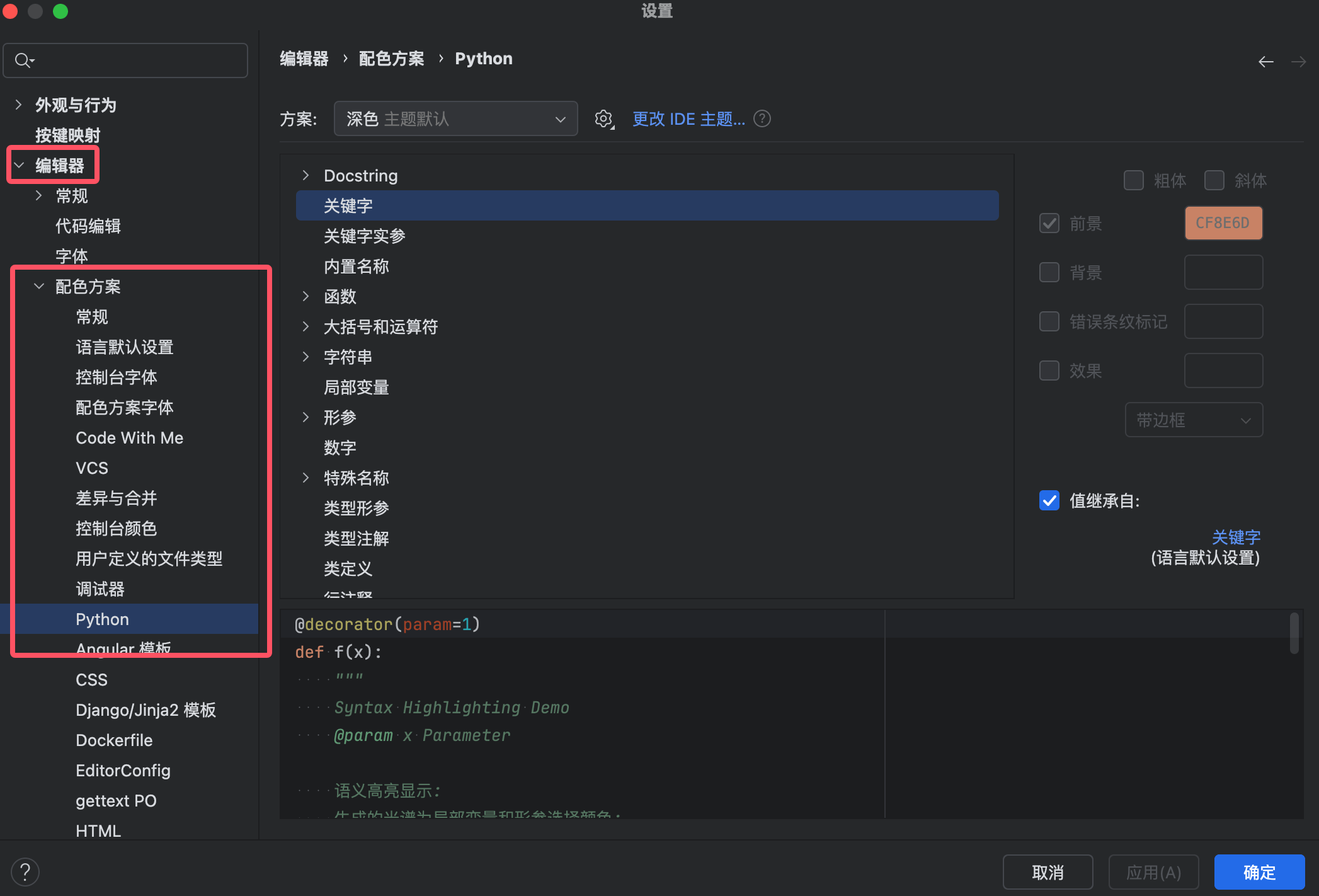 设置 → 编辑器 → 配色方案(Color Scheme) -