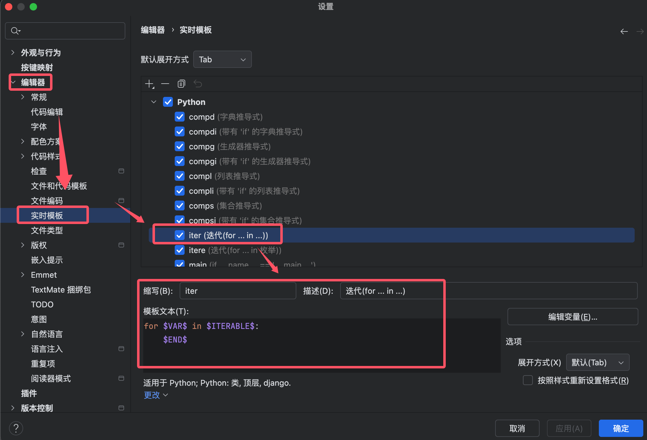 在代码编辑器中输入 iter 就可以显示模板信息: