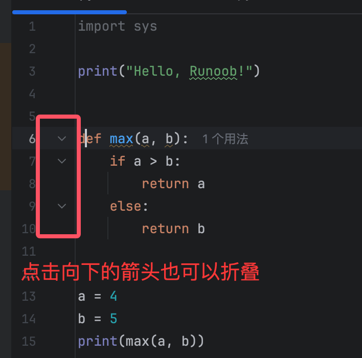鼠标移动到编辑器代码区域的左边可以看到有个向下的箭头,点击它也能折叠: