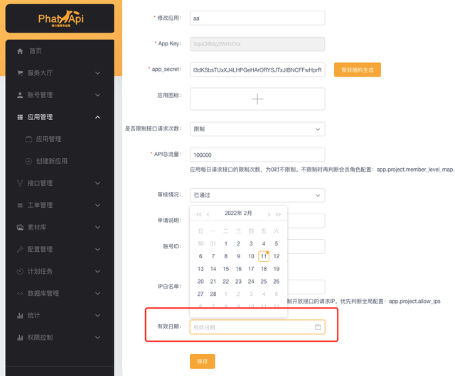 - 1、开发者应用,支持设置有效日期,到期后API接口自动失效