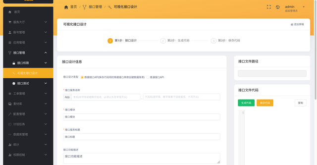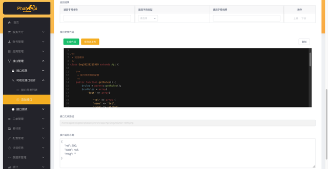 在线自动生成和添加新的API接口(含接口代码、接口文档、API接口等,都自动通过表单生成)。可以保存接口草稿、可以自动生成、可以发布接口。