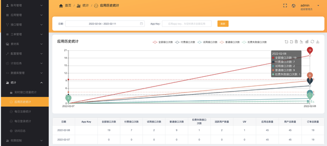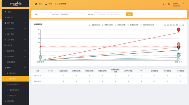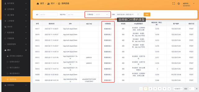 管理后台,接口统计、应用统计、访问日志升级优化,同时支持查看付费接口、试用接口、普通接口、扣费失败接口请求统计。