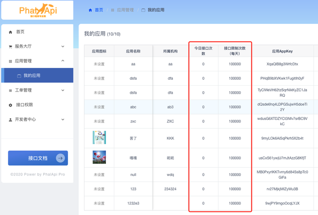 - 3、开放平台,开发者应用,支持显示可用应用数量,以及每个应用的接口统计及上限次数