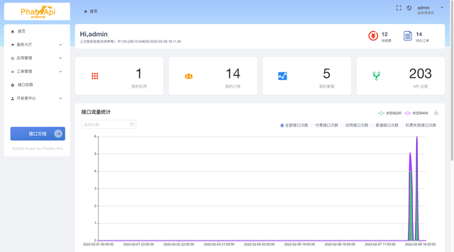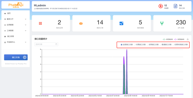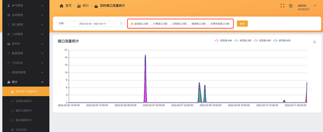 另一方面,管理员可以在后台看到全站开发者的接口流量和付费、免费试用、普通接口以及扣费失败的统计。